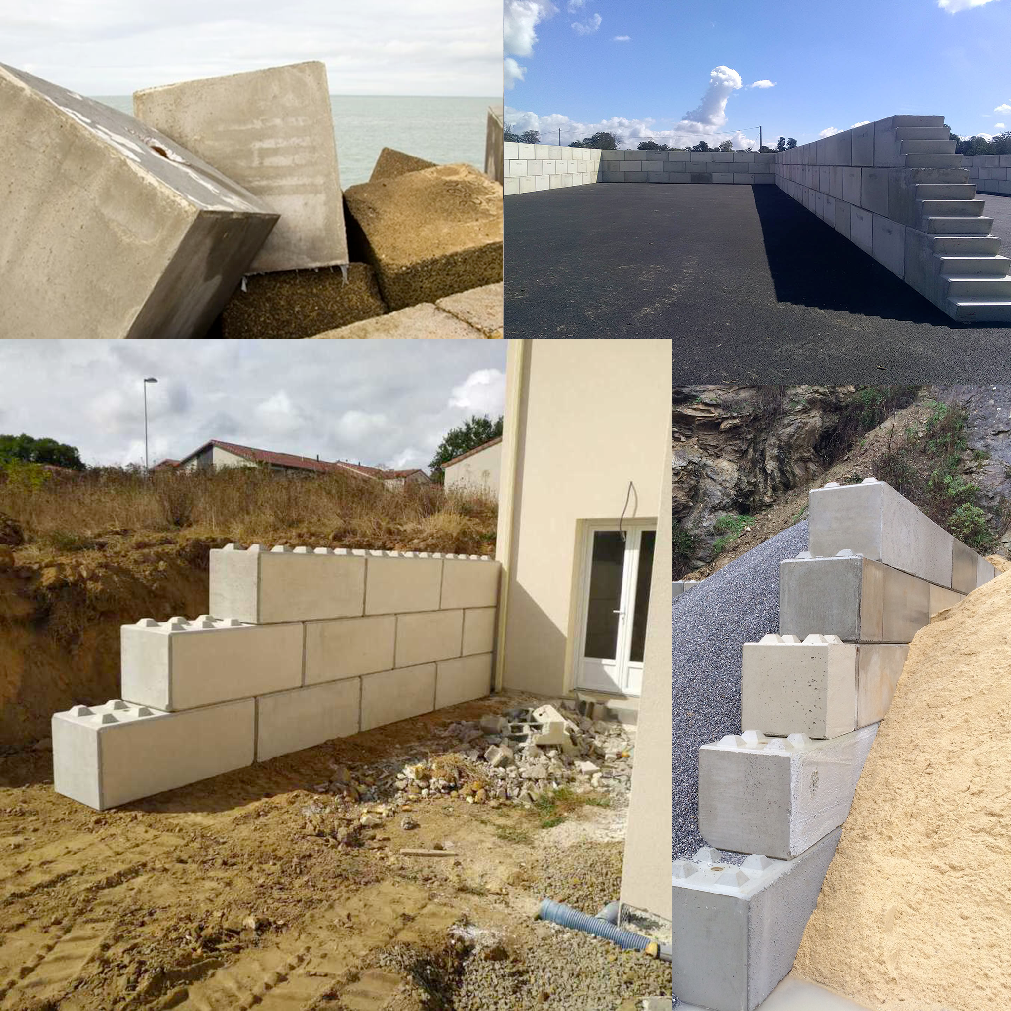 Les blocs de béton s'emboîtent automatiquement en se posant les uns sur les autres grâce à leur tenons en forme de pyramide qui suffisent à les solidariser entre eux.